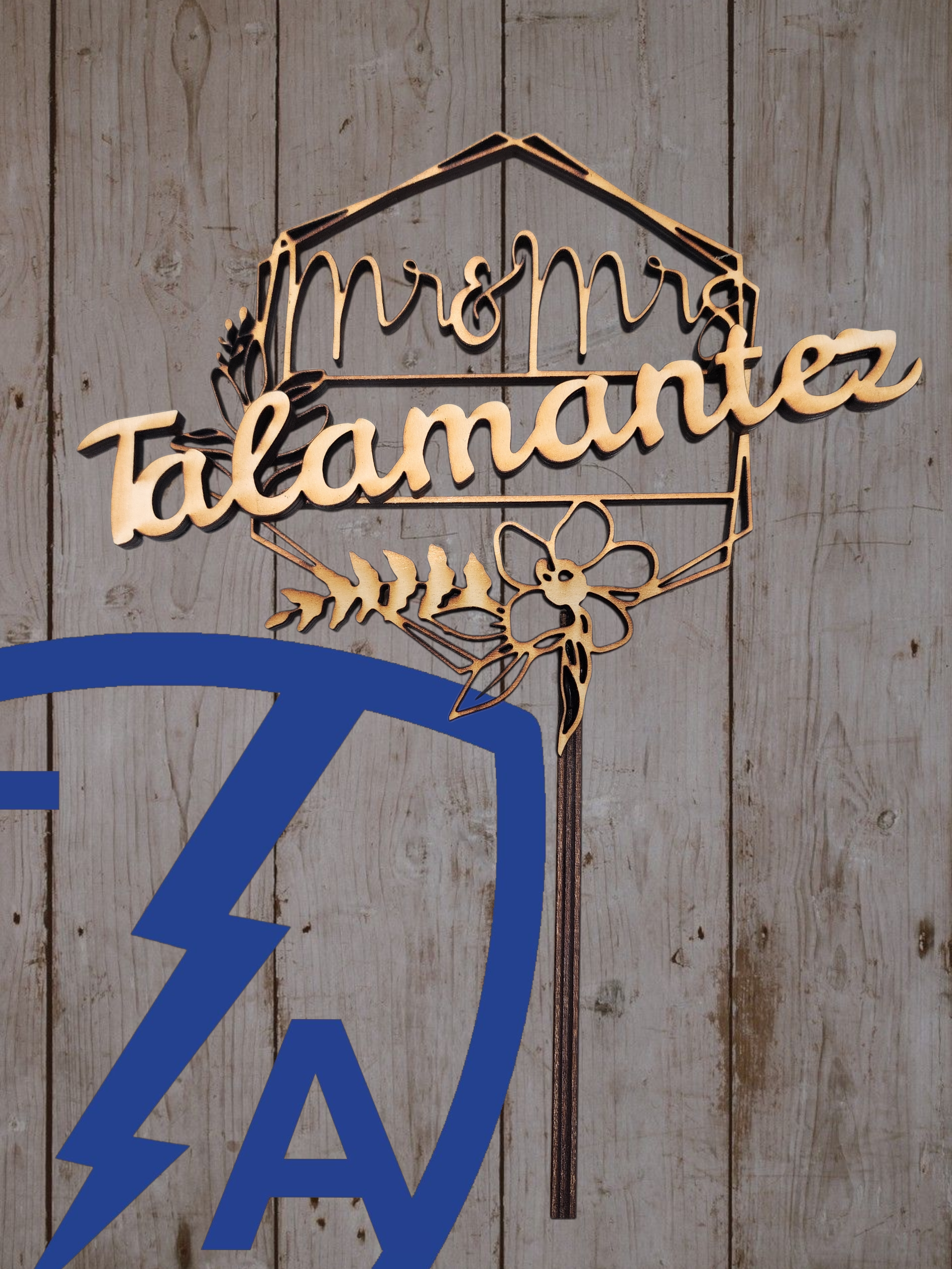 Custom cake toppers are available in wood or acrylic